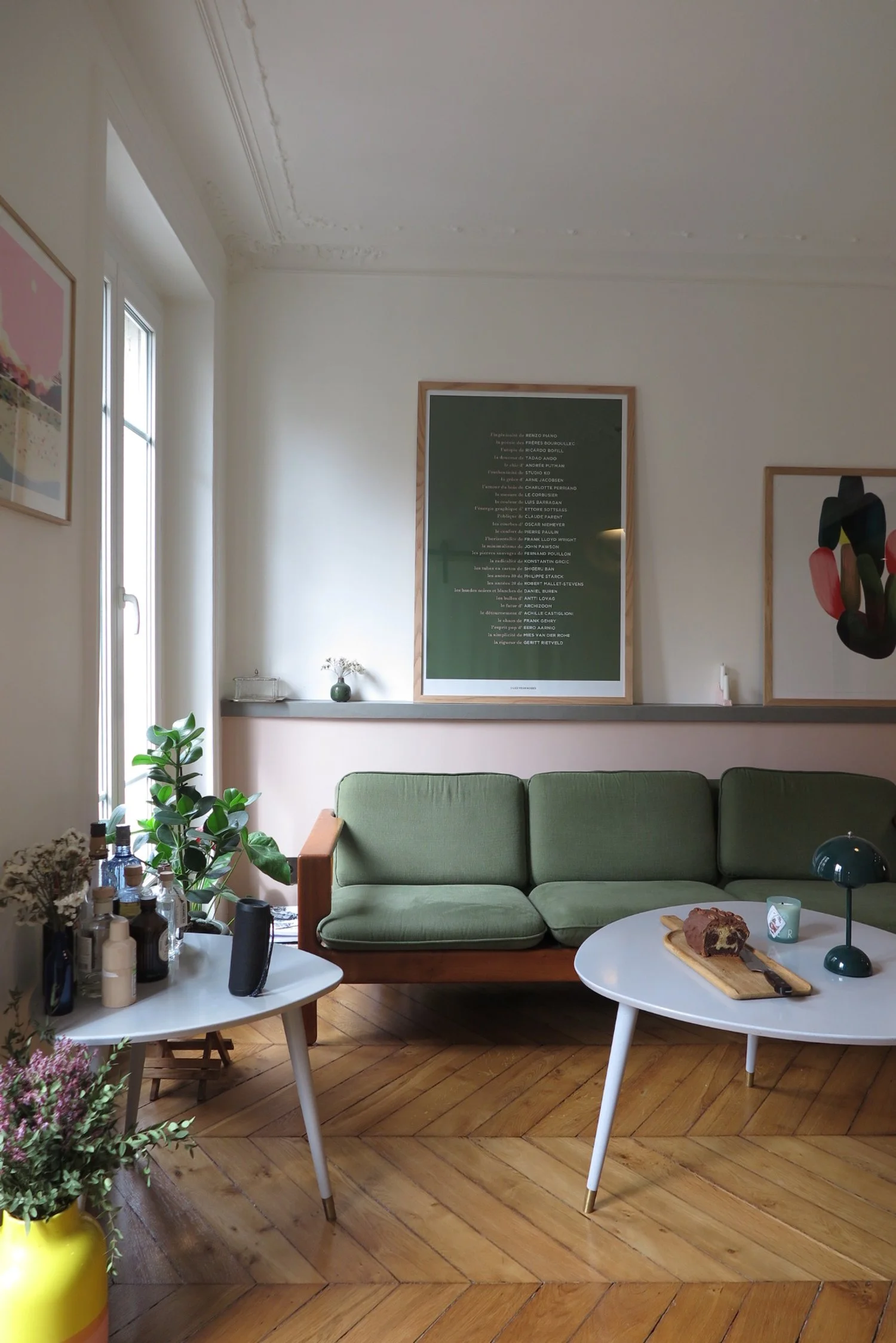 Palette verte et rose pour cet appartement de 49m2 entièrement refait par Les Yeux Roses en 2022. Agrandissement de la pièce à vivre avec suppression de poteaux porteurs et pose d’un IPN de 3,6 m.